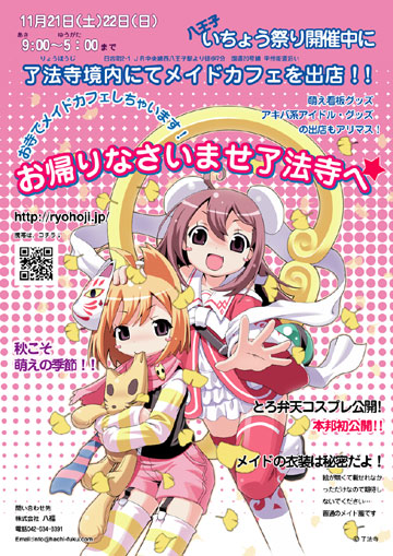 11月の21日(土)22日(日)の2日間、了法寺の境内でメイドカフェやります。思いつきでやることにしたのですが、実際やるとなるとスゴク大変です。ぐだぐだになっちゃいそうで結構ビビッております。それでも良いと言う方、八王子で遠いですが是非いらっしゃってください。あと、ご意見やアイデアなどありましたら当方にメールください。お待ちしています。