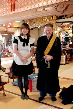 お寺の本堂で、印刷物をお願いしているアイキャンディー㈱さんの女性社員の方にメイド服を着てもらいました。(冗談で着てもらったのですが、本当に良くお似合いです。メイドカフェ当日に参加してくださるように熱烈交渉中です!!)