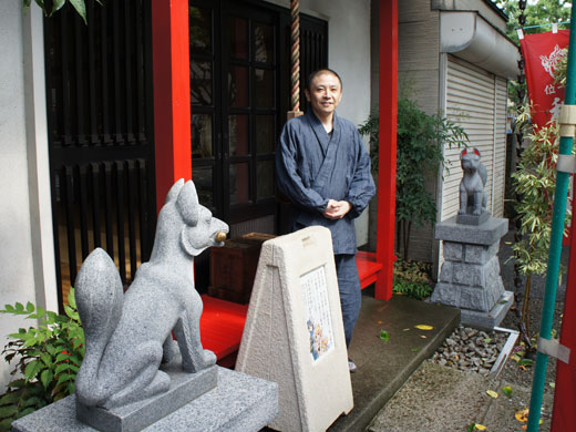 新しくなった兼族であるキツネの像と中里住職「是非見に来てください」とのコトです。